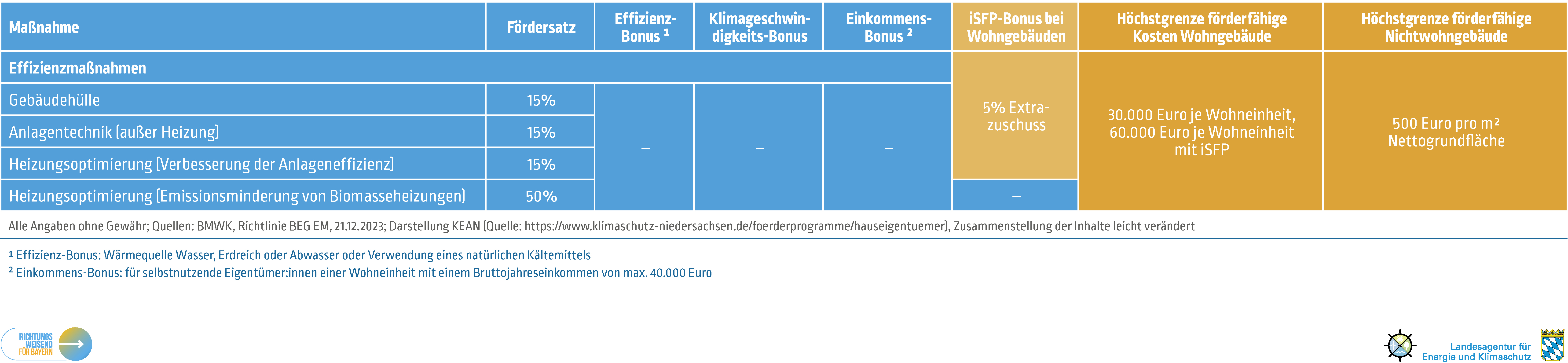 Informationen dazu finden Sie u. a. im Eckpunktepapier zum BEG – EM des Bundesministeriums für Wirtschaft und Klimaschutz. Weitere Informationen und die Bedingungen für die Antragstellung finden Sie auf den einzelnen Websites der Zuschüsse.