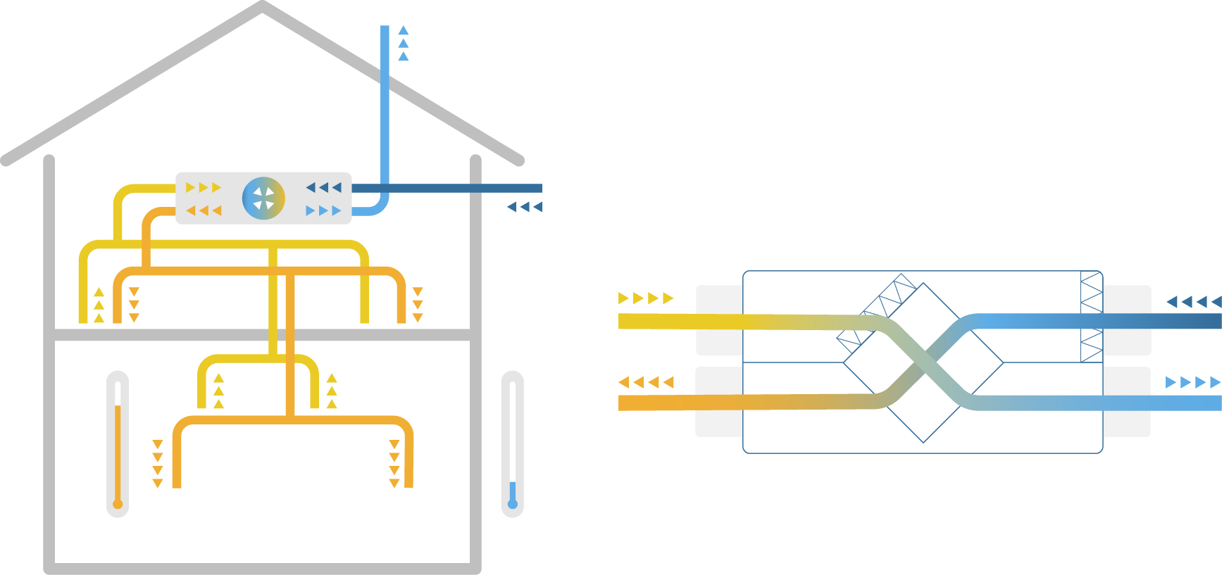 Damit Sie die Wärme aus der Abluft zurückgewinnen und für die Erwärmung der Zuluft nutzen können, müssen Zu- und Abluft in Kanälen geführt werden. Ebenso werden Zu- und Abluftventilatoren sowie ein Wärmeüberträger bzw. ein Wärmetauscher nötig.