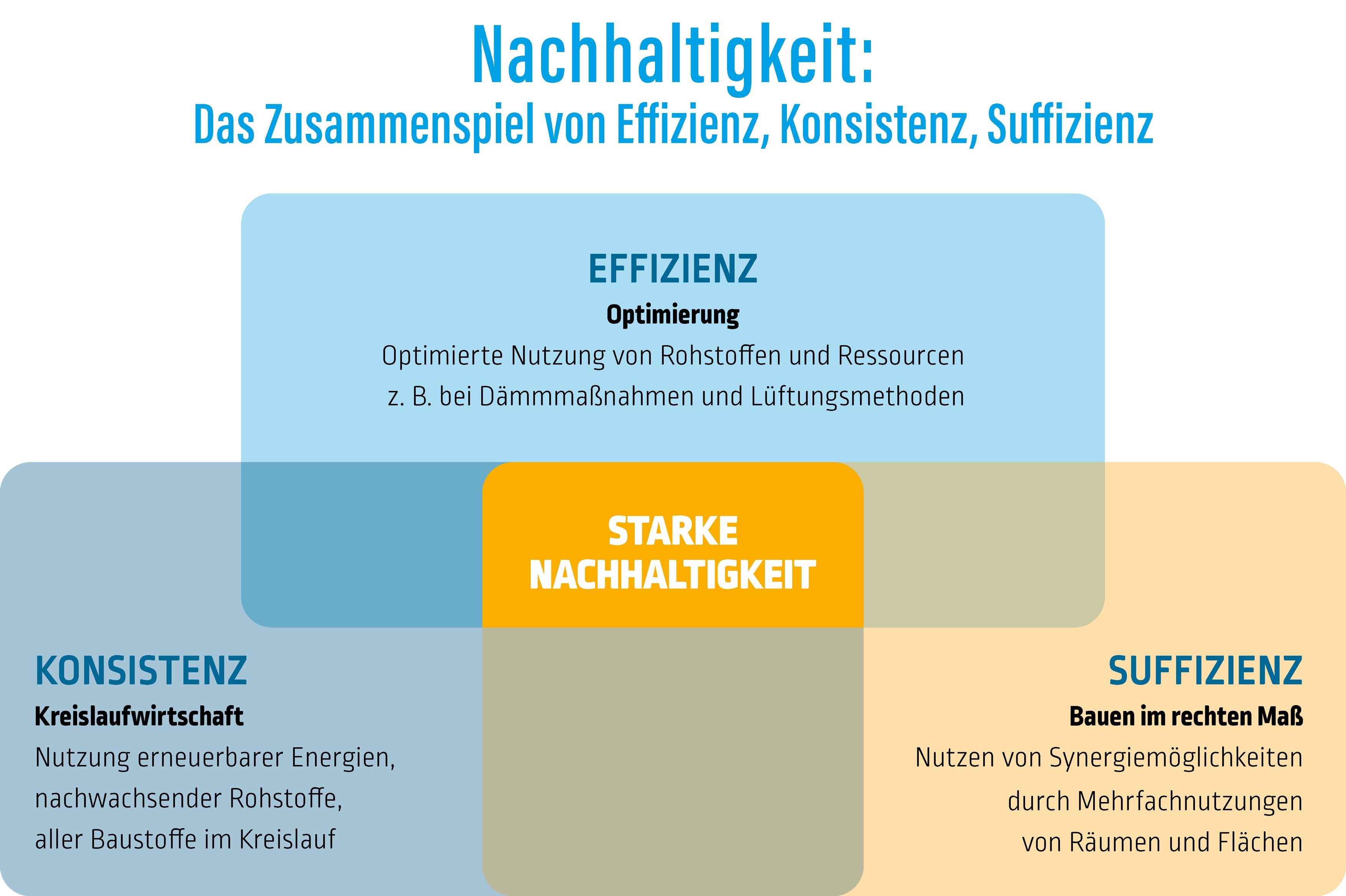 Die Art und der Umfang der Wärmedämmmaßnahmen sollten effizient sein. Das ist der Fall, wenn die Dämmmaßnahme optimal auf das Bestandsgebäude und dessen Nutzungszweck abgestimmt wird. Auch der Einsatz einer Lüftungsanlage mit Wärmerückgewinnung ist effizient, da der Ressourceneinsatz dadurch niedrig gehalten werden kann. Konsistent ist eine Planung, wenn recycelte Baumaterialien verwendet werden oder die Verbauung der Materialien in der Art erfolgt, dass diese später auch anderweitig genutzt werden können. Als konsistent (folgerichtig und sinnvoll aufgrund der Umstände) gilt natürlich die Nutzung erneuerbarer Energien. Von suffizienter Planung spricht man, wenn ein Bauvorhaben so geplant wird, dass ein möglichst niedriger Ressourcenverbrauch an Boden, Nutzfläche, Materialien und Ausstattung verursacht wird, aber dennoch alle Nutzungsbedürfnisse zufriedenstellend abgedeckt werden.